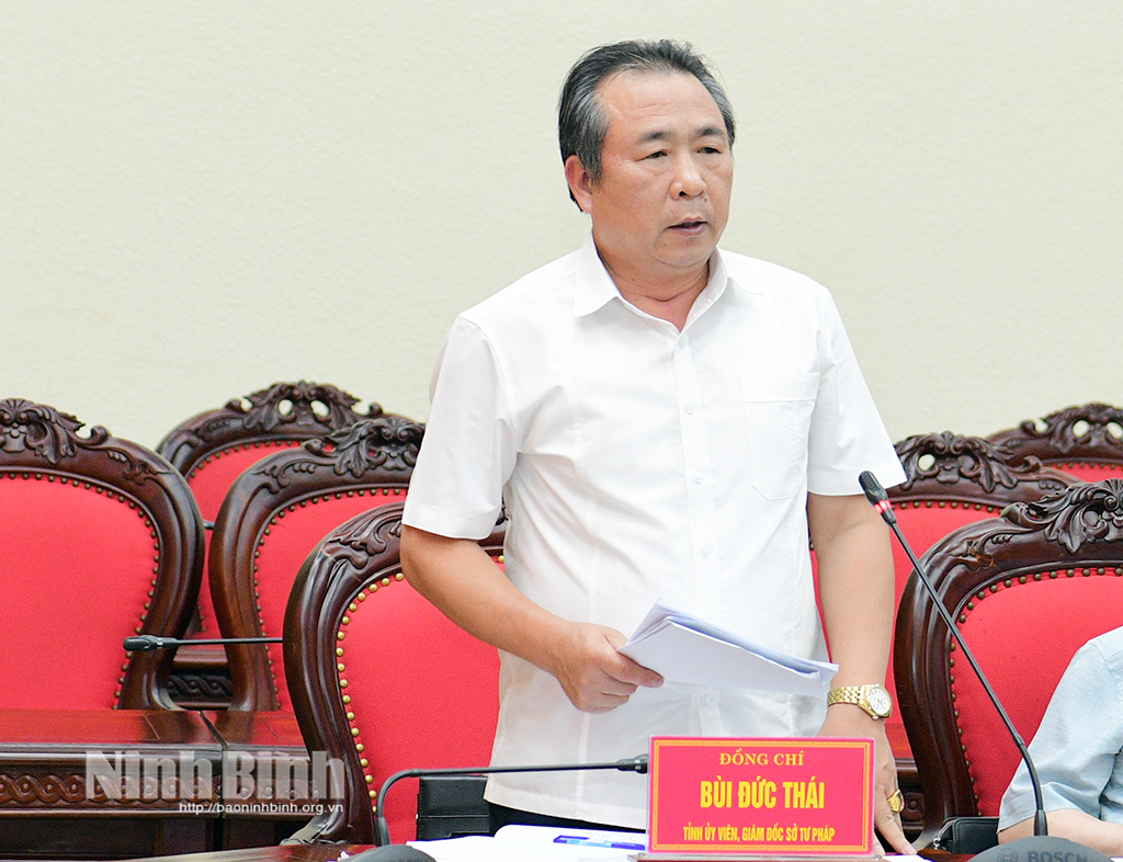 Đồng chí Bùi Đức Thái, Tỉnh ủy viên, Giám đốc Sở Tư pháp phát biểu tại hội nghị.