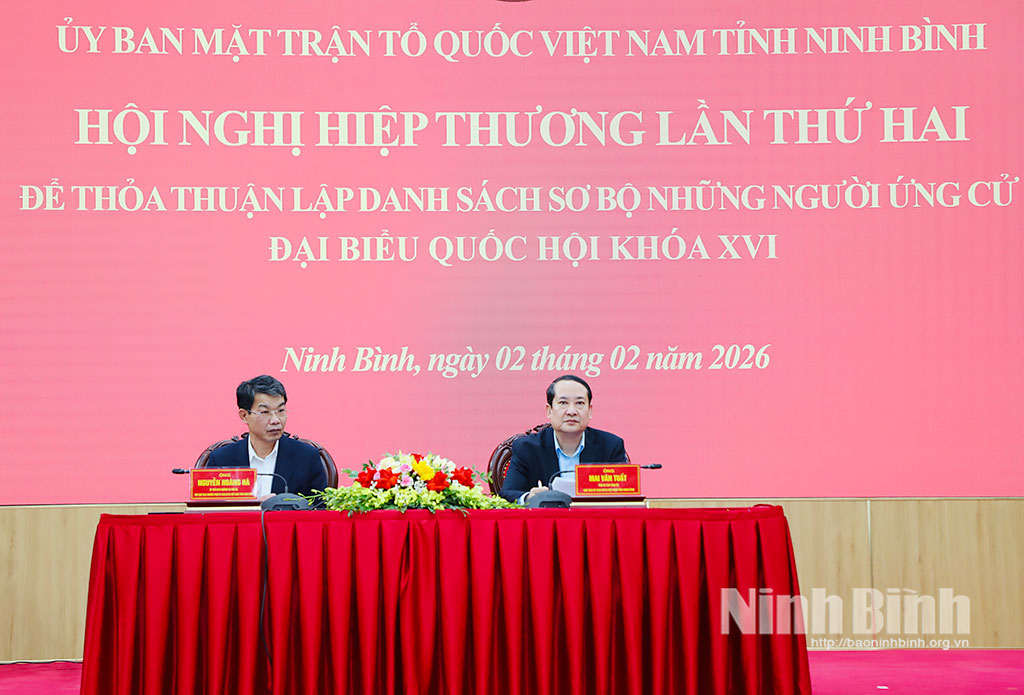 Chiều 2/2, Ban Thường trực Ủy ban MTTQ Việt Nam tỉnh tổ chức hội nghị hiệp thương lần thứ hai để thỏa thuận lập danh sách sơ bộ những người ứng cử đại biểu Quốc hội (ĐBQH) khóa XVI, nhiệm kỳ 2026-2031. Đồng chí Mai Văn Tuất, Phó Bí thư Tỉnh ủy, Chủ tịch Ủy ban MTTQ Việt Nam tỉnh, Phó Trưởng Ban Chỉ đạo Cuộc bầu cử đại biểu Quốc hội khóa XVI và đại biểu HĐND các cấp tỉnh Ninh Bình, nhiệm kỳ 2026-2031 dự và chỉ đạo hội nghị.