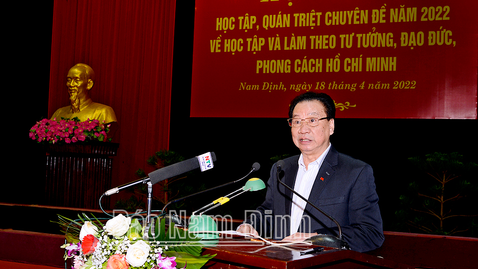 Hội nghị đã nghe quán triệt Chuyên đề “Học tập và làm theo tư tưởng, đạo đức, phong cách Hồ Chí Minh về xây dựng đội ngũ cán bộ đáp ứng yêu cầu, nhiệm vụ trong tình hình hiện nay” với các nội dung: Tư tưởng của Chủ tịch Hồ Chí Minh về đạo đức của người cán bộ; tư tưởng của Chủ tịch Hồ Chí Minh về năng lực chuyên môn của người cán bộ; tư tưởng Hồ Chí Minh về vai trò tiên phong, gương mẫu của người cán bộ; Đảng bộ tỉnh Nam Định vận dụng tư tưởng Hồ Chí Minh về xây dựng đội ngũ cán bộ các cấp trong tình hình hiện nay.