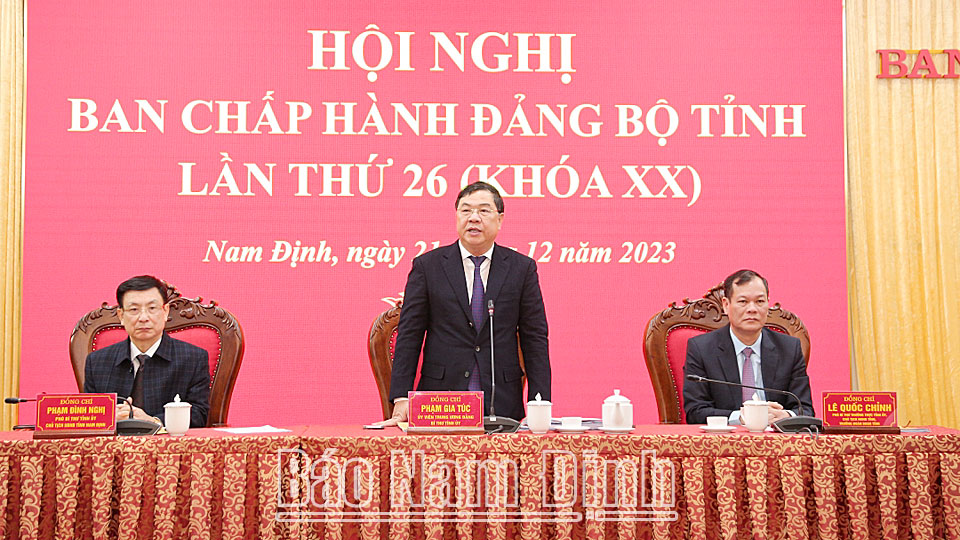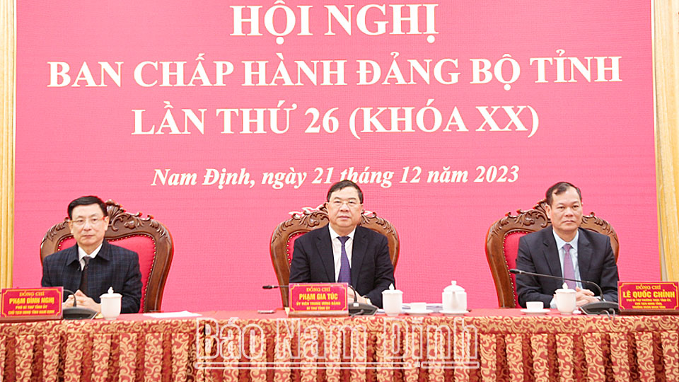 Các đồng chí: Phạm Gia Túc, Ủy viên BCH Trung ương Đảng, Bí thư Tỉnh ủy; Lê Quốc Chỉnh, Phó Bí thư Thường trực Tỉnh ủy, Chủ tịch HĐND tỉnh, Trưởng đoàn Đoàn đại biểu Quốc hội tỉnh; Phạm Đình Nghị, Phó Bí thư Tỉnh ủy, Chủ tịch UBND tỉnh chủ trì hội nghị. Dự hội nghị có các đồng chí Ủy viên Ban TVTU, Ủy viên BCH Đảng bộ tỉnh; lãnh đạo các sở, ban, ngành, đoàn thể của tỉnh và các huyện, thành phố Nam Định.
