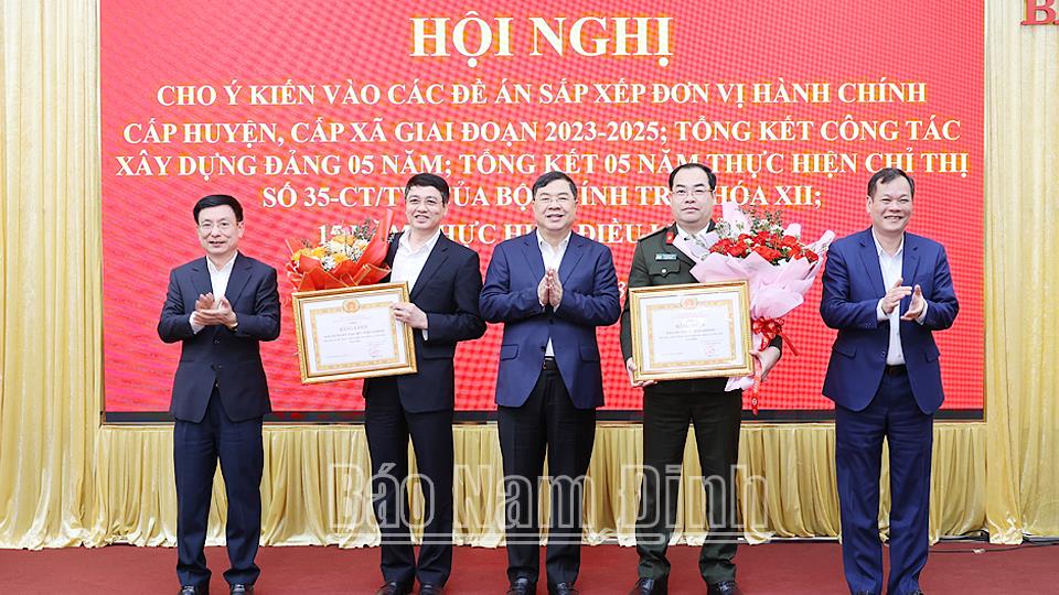 | Các đồng chí Thường trực Tỉnh ủy trao Bằng khen Đảng bộ đạt tiêu chuẩn hoàn thành xuất sắc nhiệm vụ tiêu biểu năm 2023 của Ban TVTU cho Đảng bộ huyện Giao Thủy và Đảng bộ Công an tỉnh. |