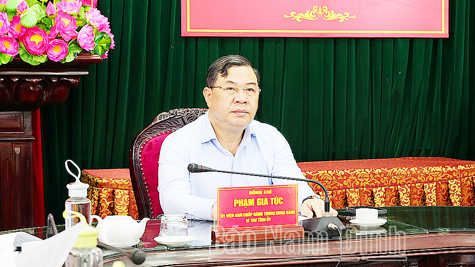 | Đồng chí Phạm Gia Túc, Ủy viên BCH Trung ương Đảng, Bí thư Tỉnh ủy chủ trì hội nghị tại điểm cầu Nam Định. |