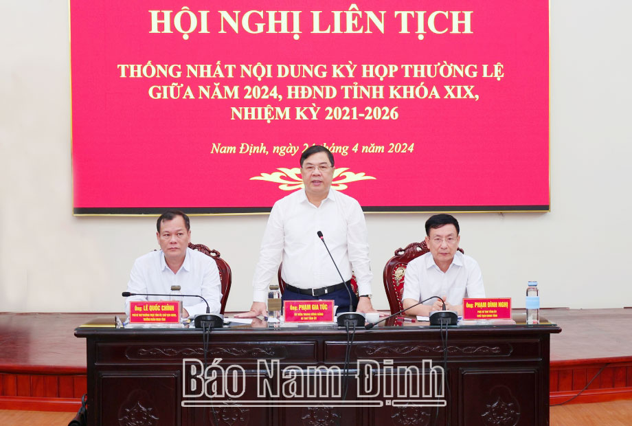 Phát biểu chỉ đạo hội nghị, đồng chí Bí thư Tỉnh ủy Phạm Gia Túc đánh giá cao sự phối hợp giữa HĐND, UBND, Ủy ban MTTQ tỉnh trong việc duy trì nền nếp hội nghị liên tịch để chuẩn bị điều kiện tốt nhất cho các kỳ họp thường lệ HĐND tỉnh. Đồng chí Bí thư Tỉnh ủy đề nghị sớm hoàn thiện nội dung, chương trình kỳ họp thường lệ giữa năm 2024; các báo cáo cần ngắn gọn, cụ thể hơn. Các cơ quan, đơn vị tăng cường phối hợp với các Ban HĐND tỉnh trong thẩm tra các văn bản, báo cáo trình kỳ họp; số liệu các báo cáo phải chính xác, thống nhất. Trong kỳ họp cần tăng cường nội dung chất vấn theo hướng thực chất, hiệu quả; khi quyết sách những vấn đề mới, nội dung phát sinh phải tuân thủ đúng quy định của pháp luật; đồng thời đẩy mạnh công tác thông tin, tuyên truyền để cử tri và nhân dân hiểu đầy đủ nội dung kỳ họp.