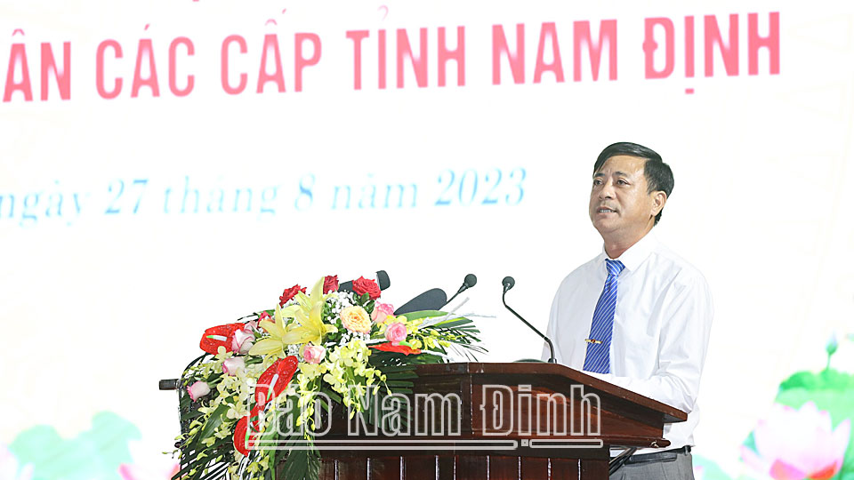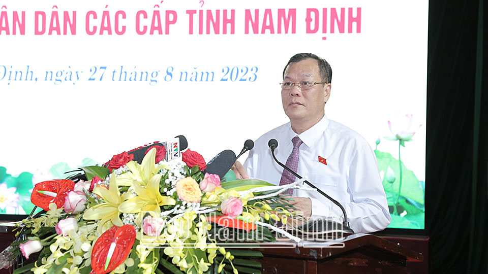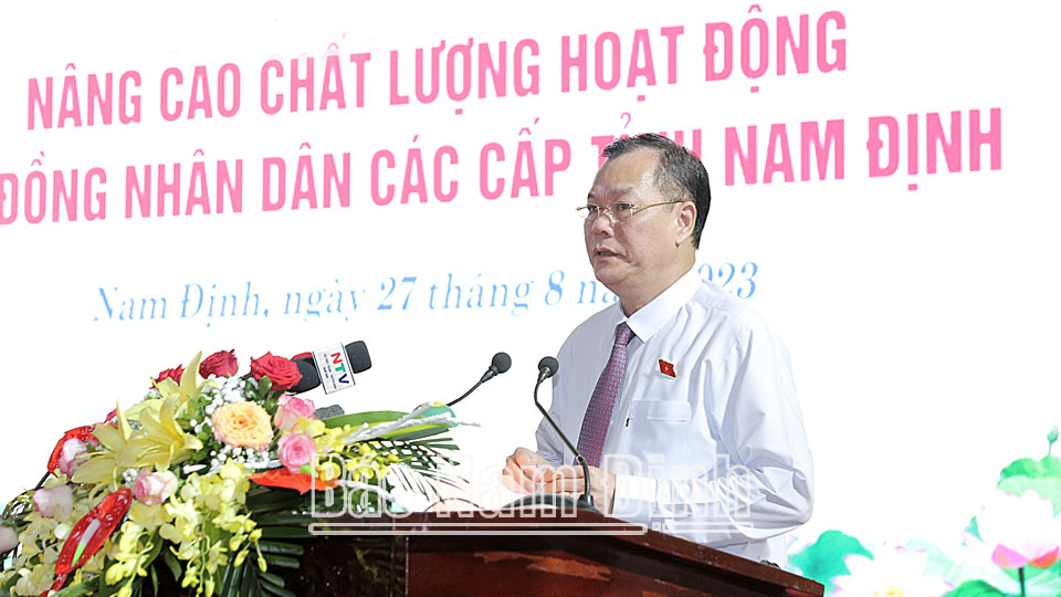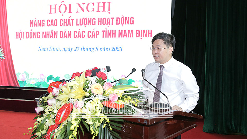 Phát biểu kết luận và bế mạc hội nghị, đồng chí Phó Bí thư Thường trực Tỉnh ủy, Chủ tịch HĐND tỉnh Lê Quốc Chỉnh khẳng định: Với vai trò đại diện cho ý chí, nguyện vọng và quyền làm chủ của nhân dân, HĐND các cấp tỉnh Nam Định quyết tâm nỗ lực hơn nữa cùng với các cấp, các ngành thực hiện thắng lợi các mục tiêu phát triển kinh tế - xã hội đã đề ra, để xứng đáng lòng tin và sự mong đợi của nhân dân trong tỉnh. Trước mắt, HĐND các cấp tỉnh Nam Định cần tập trung một số nhiệm vụ trọng tâm như: Chủ động, tích cực thực hiện tốt nhiệm vụ, quyền hạn theo quy định của pháp luật. Chấp hành nghiêm túc, kịp thời sự lãnh đạo, chỉ đạo của các cấp ủy Đảng. Phối hợp chặt chẽ với Ủy ban MTTQ, đồng hành cùng UBND cùng cấp tổ chức triển khai thắng lợi các nghị quyết về phát triển kinh tế - xã hội, đảm bảo an ninh quốc phòng, xây dựng chính quyền địa phương vững mạnh. Tăng cường vai trò, trách nhiệm của Thường trực HĐND, các Ban HĐND; nâng cao năng lực, uy tín của đại biểu HĐND các cấp gắn với nâng cao chất lượng hoạt động của các Tổ đại biểu HĐND. Thực hiện tốt nhiệm vụ, quyền hạn của HĐND trong việc sắp xếp đơn vị hành chính cấp huyện, cấp xã giai đoạn 2023-2030 theo quy định. Tổ chức lấy phiếu tín nhiệm, bỏ phiếu tín nhiệm đối với người giữ chức vụ do HĐND bầu tại kỳ họp thường lệ cuối năm 2023 theo đúng quy định của Đảng và Nghị quyết của Quốc hội. Tham mưu, chuẩn bị tốt các điều kiện cho cuộc bầu cử đại biểu HĐND các cấp nhiệm kỳ 2026-2031. (Bài phát biểu bế mạc hội nghị của đồng chí Lê Quốc Chỉnh, Phó Bí thư Thường trực Tỉnh ủy, Chủ tịch HĐND tỉnh, Trưởng đoàn Đoàn đại biểu Quốc hội tỉnh)
