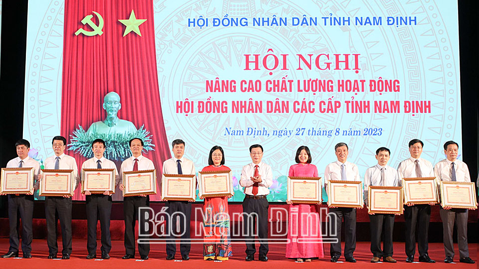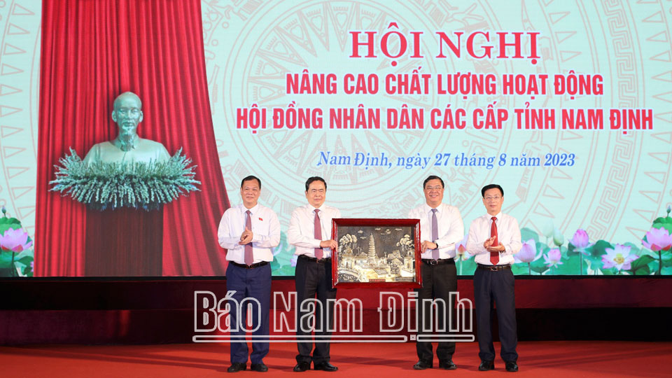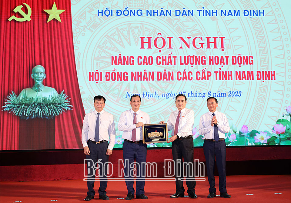Nhân dịp này, đồng chí Phó Chủ tịch Thường trực Quốc hội Trần Thanh Mẫn đã trao tặng Thường trực HĐND tỉnh bức tranh Tòa nhà Quốc hội; Tỉnh ủy, HĐND, UBND tỉnh trao tặng đồng chí Phó Chủ tịch Thường trực Quốc hội bức tranh Tháp Phổ Minh, biểu tượng lịch sử - văn hóa của quê hương Nam Định. Đồng chí Chủ tịch UBND tỉnh Phạm Đình Nghị và các đồng chí Phó Chủ tịch UBND tỉnh tặng Bằng khen cho 52 tập thể đã có thành tích xuất sắc trong tham mưu, phục vụ và hoạt động của HĐND các cấp tỉnh Nam Định từ năm 2021 đến năm 2023 (nhiệm kỳ 2021-2026)./.