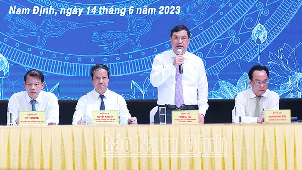 | Các đồng chí Nguyễn Kim Sơn, Ủy viên BCH Trung ương Đảng, Bộ trưởng Bộ Giáo dục và Đào tạo; Phạm Gia Túc, Uỷ viên BCH Trung ương Đảng, Bí thư Tỉnh uỷ Nam Định; Vũ Thanh Mai, Phó Trưởng Ban Tuyên Giáo Trung ương; Đặng Xuân Phương, Phó Chủ nhiệm Ủy ban Văn hóa, Giáo dục của Quốc hội; Hoàng Minh Sơn, Thứ trưởng Bộ Giáo dục và Đào tạo chủ trì Hội nghị. |