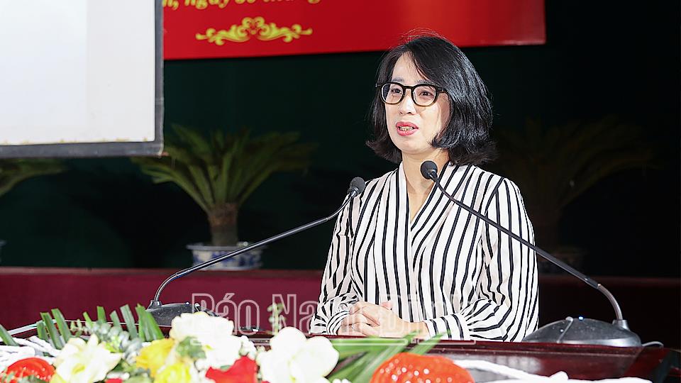 | Đồng chí Phạm Thu Hằng, Vụ trưởng Vụ Thông tin báo chí, kiêm Người phát ngôn Bộ Ngoại giao thông báo tình hình thời sự tới cán bộ chủ chốt của tỉnh. |
