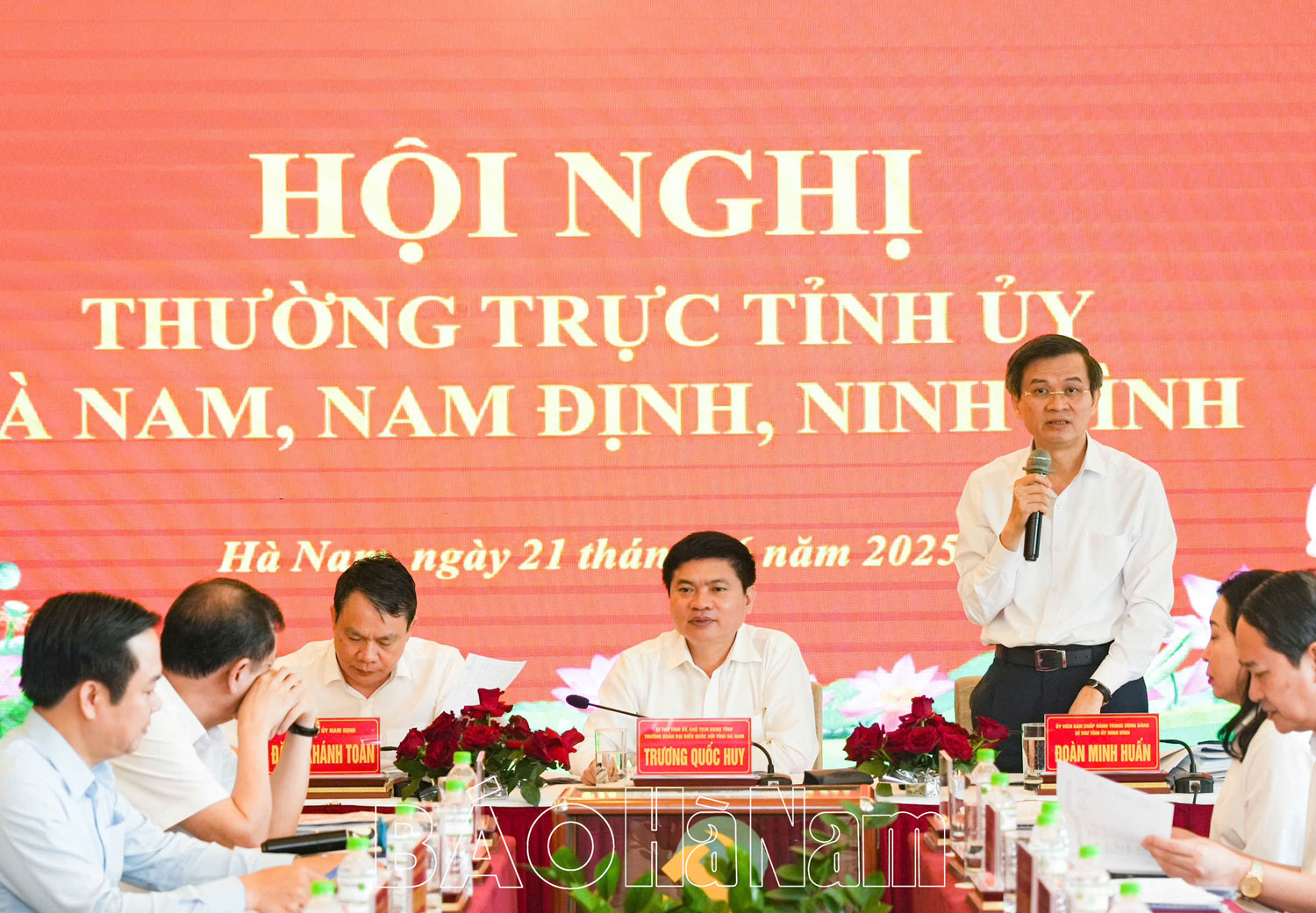 Sáng 21/6, tại thành phố Phủ Lý, Thường trực Tỉnh ủy Hà Nam, Nam Định, Ninh Bình tổ chức hội nghị thảo luận, thông qua các nội dung liên quan về công tác tổ chức bộ máy và công tác cán bộ thực hiện hợp nhất, sáp nhập tỉnh. Các đồng chí: Trương Quốc Huy, Bí thư Tỉnh ủy, Chủ tịch UBND tỉnh, Trưởng Đoàn ĐBQH tỉnh Hà Nam; Đoàn Minh Huấn, Ủy viên Trung ương Đảng, Bí thư Tỉnh ủy Ninh Bình; Đặng Khánh Toàn, Bí thư Tỉnh ủy Nam Định chủ trì hội nghị. Dự hội nghị có các đồng chí Thường trực Tỉnh ủy; Trưởng Ban Tổ chức Tỉnh ủy, Sở Nội vụ, Văn phòng Tỉnh uỷ, Văn phòng UBND tỉnh các tỉnh Hà Nam, Nam Định, Ninh Bình.