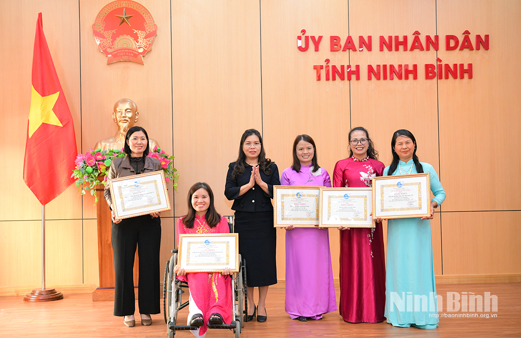 Ngay sau hội nghị trực tuyến, tại điểm cầu tỉnh Ninh Bình, Hội Liên hiệp Phụ nữ tỉnh đã tặng Bằng khen cho 9 tập thể và 15 cá nhân có thành tích xuất sắc trong thực hiện Đề án Hỗ trợ phụ nữ khởi nghiệp giai đoạn 2017-2025.