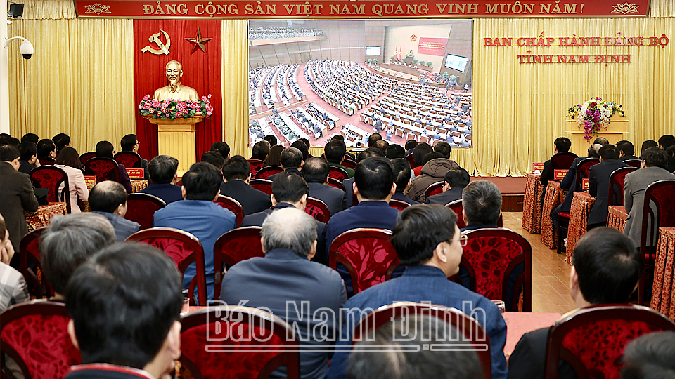 | Các đồng chí Thường trực Tỉnh ủy: Đặng Khánh Toàn, Bí thư Tỉnh ủy; Lê Quốc Chỉnh, Phó Bí thư Thường trực Tỉnh ủy, Trưởng đoàn Đoàn đại biểu Quốc hội tỉnh, Chủ tịch HĐND tỉnh; Phạm Đình Nghị, Phó Bí thư Tỉnh ủy, Chủ tịch UBND tỉnh và các đại biểu dự hội nghị tại điểm cầu tỉnh Nam Định. |