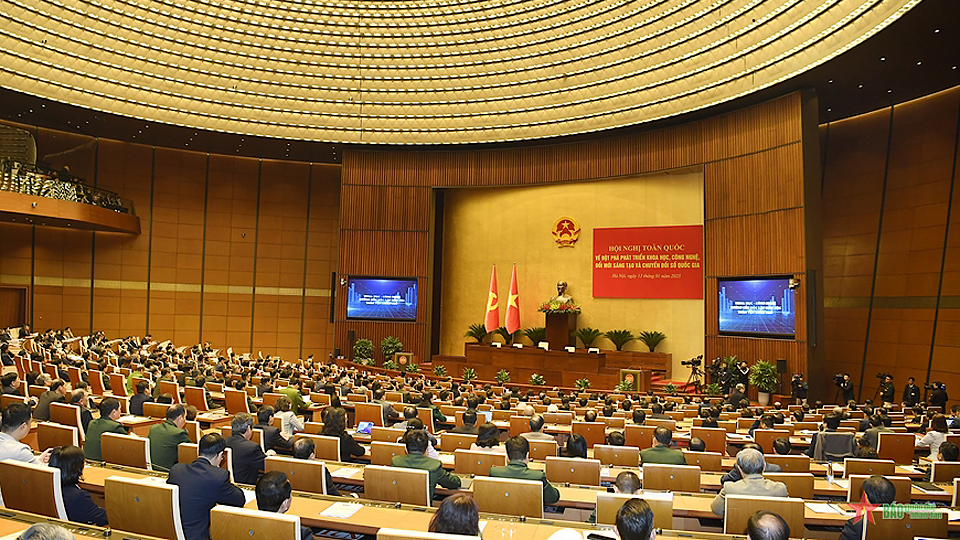 Sáng 13/1, tại Hà Nội, Bộ Chính trị, Ban Bí thư Trung ương Đảng tổ chức Hội nghị toàn quốc về đột phá phát triển khoa học, công nghệ (KHCN), đổi mới sáng tạo (ĐMST) và chuyển đổi số (CĐS) quốc gia. Hội nghị được tổ chức bằng hình thức trực tiếp từ Hội trường Diên Hồng (Nhà Quốc hội) kết hợp trực tuyến tới hơn 15 nghìn điểm cầu trên toàn quốc với gần 980 nghìn đại biểu tham dự ở các Đảng ủy trực thuộc Trung ương; các cơ quan tham mưu, giúp việc của Đảng ở Trung ương, Ban cán sự đảng các bộ, ngành, đơn vị, Đảng đoàn MTTQ Việt Nam, các tổ chức chính trị - xã hội; các tỉnh ủy, thành ủy trực thuộc Trung ương…