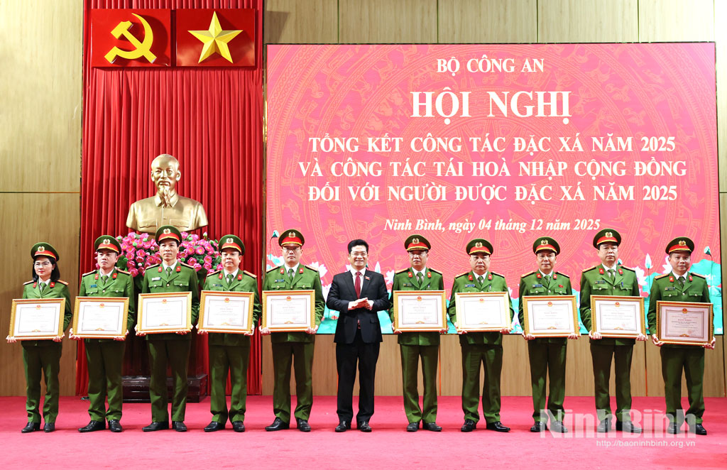 Tại điểm cầu tỉnh Ninh Bình, nhiều tập thể, cá nhân có thành tích xuất sắc trong công tác đặc xá và công tác tái hoà nhập cộng đồng đối với người được đặc xá năm 2025 được Chủ tịch UBND tỉnh và Giám đốc Công an tỉnh biểu dương, khen thưởng.