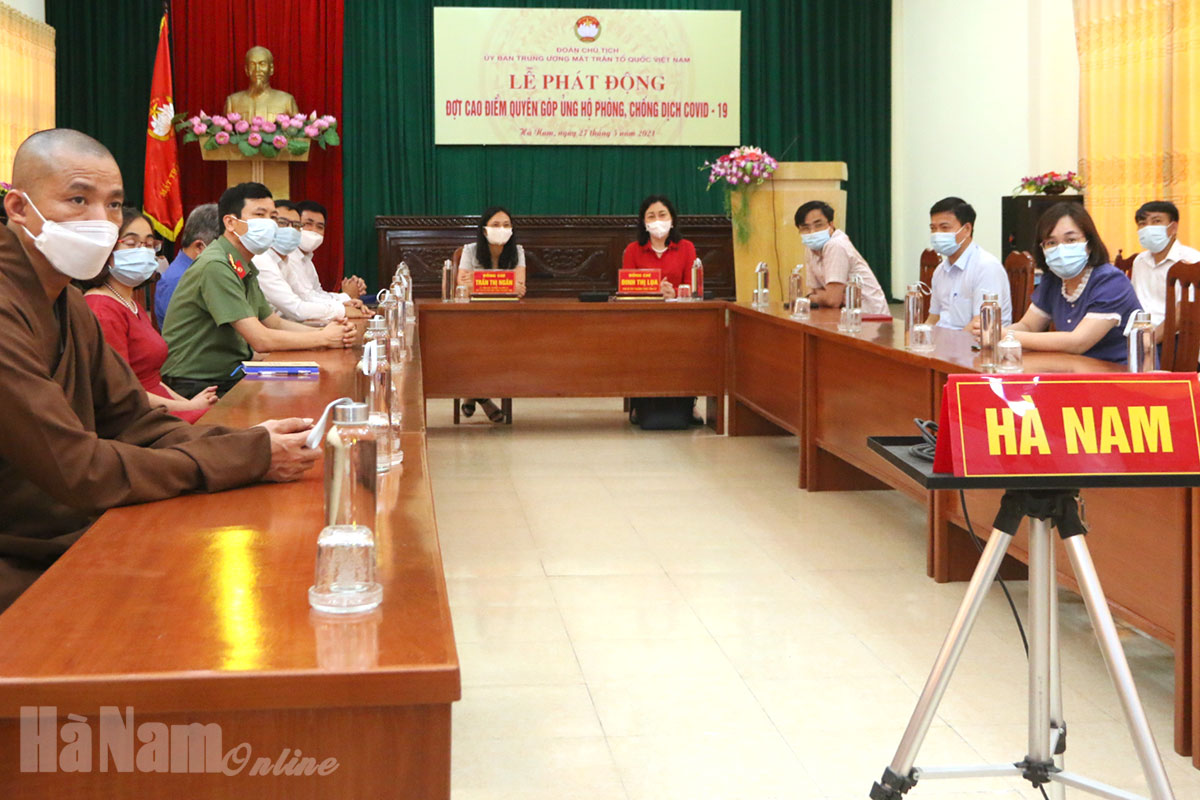 Ngay sau lễ phát động, hưởng ứng lời kêu gọi của Đoàn Chủ tịch Ủy ban Trung ương MTTQ Việt Nam, thay mặt Ban Chỉ đạo phòng, chống dịch Covid -19 tỉnh, đồng chí Trần Thị Ngân tiếp nhận sự ủng hộ hỗ trợ từ doanh nghiệp Công ty Cổ phần tập đoàn BRG 10 nghìn khẩu trang và 500 triệu đồng; Công ty Cổ phần thương mại Ngôi nhà mới 500 triệu đồng, Giáo hội phật giáo Việt Nam thị xã Duy Tiên 20 triệu đồng./.