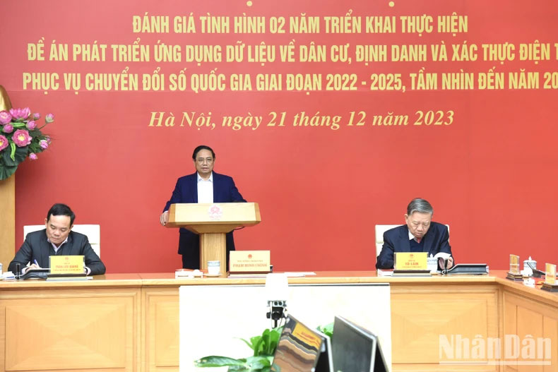 Chiều 21/12, Thủ tướng Phạm Minh Chính, Chủ tịch Ủy ban Quốc gia về chuyển đổi số, chủ trì Hội nghị đánh giá tình hình 02 năm triển khai thực hiện đề án phát triển ứng dụng dữ liệu về dân cư, định danh và xác thực điện tử phục vụ chuyển đổi số quốc gia giai đoạn 2022-2025, tầm nhìn đến năm 2030 (Đề án 06). Cùng dự có Đại tướng Tô Lâm, Ủy viên Bộ Chính trị, Bộ trưởng Công an, Tổ trưởng Tổ công tác triển khai Đề án 06; Phó Thủ tướng Chính phủ Trần Lưu Quang, Phó Chủ tịch Thường trực Ủy ban.