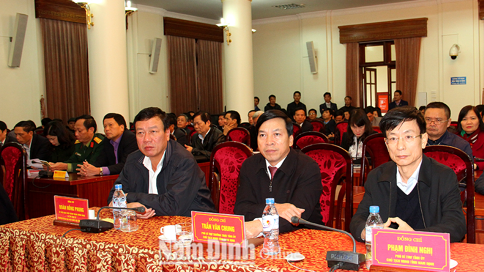 | Các đồng chí: Đoàn Hồng Phong, Uỷ viên Ban chấp hành Trung ương Đảng, Bí thư Tỉnh uỷ, Trưởng đoàn Đoàn đại biểu Quốc hội của tỉnh; Trần Văn Chung, Phó Bí thư Thường trực Tỉnh uỷ, Chủ tịch HĐND tỉnh; Phạm Đình Nghị, Phó Bí thư Tỉnh uỷ, Chủ tịch UBND tỉnh tham dự hội nghị. |