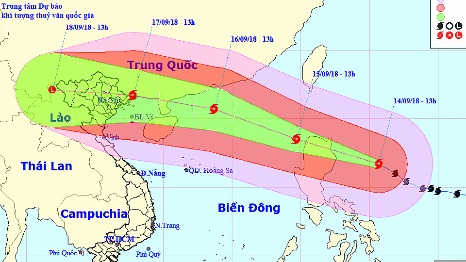 Hồi 13 giờ ngày 14-9, vị trí tâm siêu bão Mangkhut ở vào khoảng 16,7 độ Vĩ bắc; 125,7 độ Kinh đông, cách đảo Lu-dông (Phi-líp-pin) khoảng 360km về phía Đông. Sức gió mạnh nhất vùng gần tâm siêu bão mạnh cấp 17 (200-220km/giờ), giật trên cấp 17. Dự báo trong 24 giờ tới, siêu bão di chuyển theo hướng Tây Tây Bắc, mỗi giờ đi được khoảng 25km. Như vậy, khoảng trưa và chiều 15-9 bão sẽ đi vào khu vực Đông Bắc của Biển Đông. Sức gió mạnh nhất vùng gần tâm siêu bão mạnh cấp 15, giật trên cấp 17. Phạm vi gió mạnh cấp 6, giật cấp 8 trở lên khoảng 400km tính từ vùng tâm bão; phạm vi gió mạnh cấp 10 trở lên khoảng 200km tính từ vùng tâm bão. Do ảnh hưởng của bão, từ đêm 14-9 ở vùng biển Đông Bắc Biển Đông có mưa bão và gió mạnh dần lên cấp 11-12, từ sáng 15-9 tăng lên cấp 14-15, giật trên cấp 17; biển động dữ dội. Vùng nguy hiểm trên Biển Đông trong 24 giờ tới (vùng gió mạnh cấp 6 trở lên): phía Bắc vĩ tuyến 15,0 độ Vĩ Bắc; phía Đông kinh tuyến 115,0 độ Kinh Đông. Trong 24 đến 48 giờ tiếp theo, siêu bão di chuyển theo hướng Tây Tây Bắc, mỗi giờ đi được khoảng 25km. Đến 13 giờ ngày 16-9, vị trí tâm bão ở khoảng 20,7 độ Vĩ bắc; 113,7 độ Kinh đông, trên khu vực Bắc Biển Đông và cách bán đảo Lôi Châu (Trung Quốc) khoảng 340km về phía Đông. Sức gió mạnh nhất vùng gần tâm bão mạnh cấp 13-14, giật cấp 17. Cấp độ rủi ro thiên tai: cấp 3-4. Trong 48 đến 72 giờ tiếp theo, bão di chuyển theo hướng Tây Tây Bắc, mỗi giờ đi được khoảng 25km. Đến 13 giờ ngày 17-9, vị trí tâm bão ở khoảng 21,7 độ Vĩ bắc; 107,8 độ Kinh đông, ngay trên khu vực biên giới Việt - Trung. Sức gió mạnh nhất vùng gần tâm bão mạnh cấp 10-11, giật cấp 14. Cấp độ rủi ro thiên tai: cấp 3-4. Khả năng cao bão sẽ ảnh hưởng trực tiếp đến Vịnh Bắc Bộ trong khoảng ngày 16, 17-9 và ảnh hưởng trực tiếp đến đất liền nước ta trong khoảng ngày 17, 18-9. Hoàn lưu bão gây mưa rất to cho Bắc Bộ và Bắc Trung Bộ từ 17 đến 19-9.