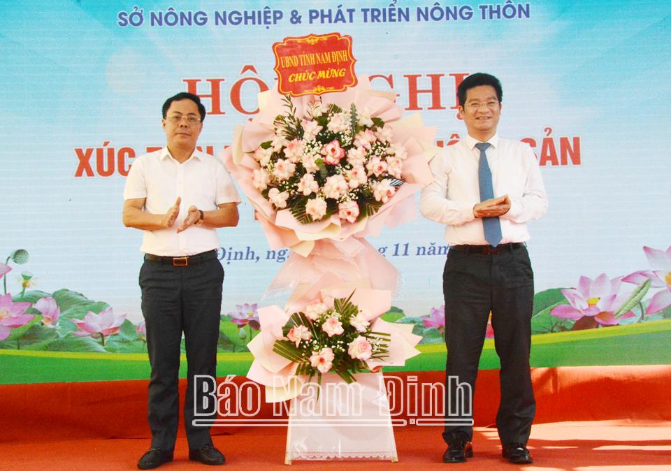 | Đồng chí Trần Anh Dũng, Ủy viên Ban TVTU, Phó Chủ tịch Thường trực UBND tỉnh tặng hoa chúc mừng Sở NN và PTNT tổ chức thành công hội nghị xúc tiến thương mại nông sản an toàn năm 2024. |