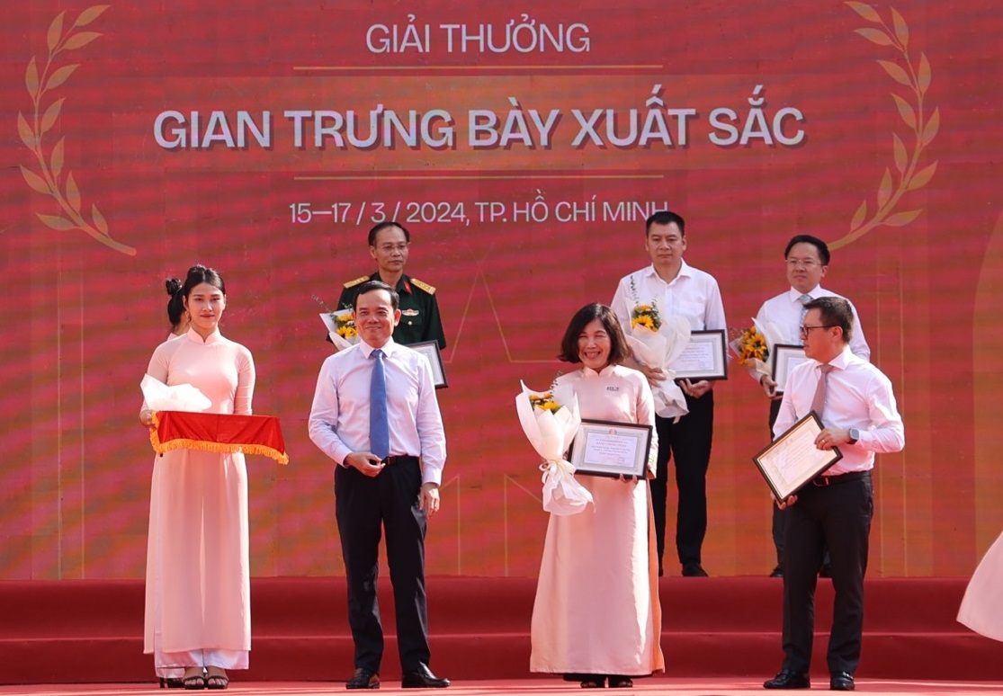 | Đồng chí Trần Lưu Quang, Ủy viên BCH Trung ương Đảng, Phó Thủ tướng Chính phủ trao giải Gian trưng bày xuất sắc cho Thông tấn xã Việt Nam. Ảnh: An Hiếu |