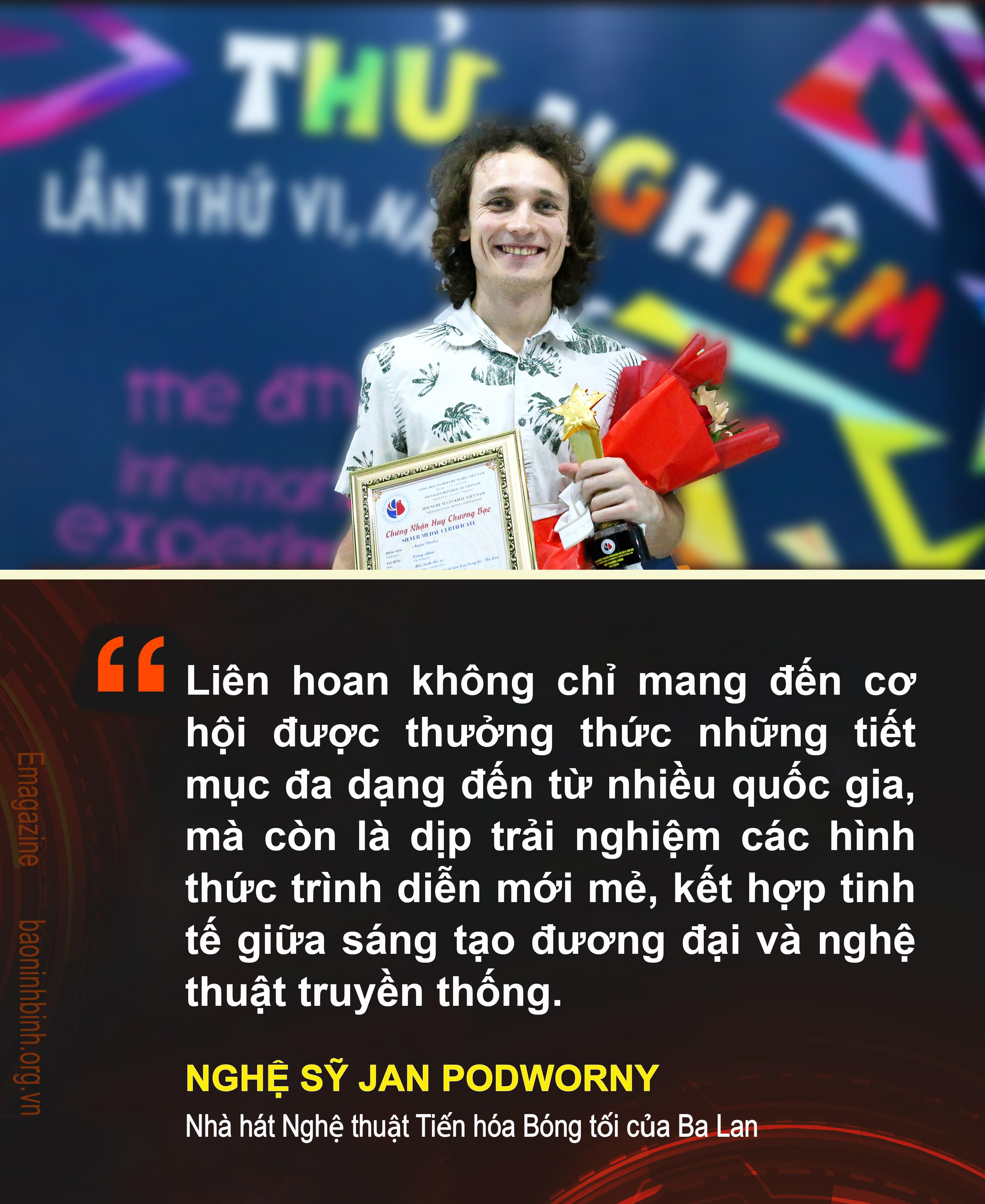 Nghệ sỹ Jan Podworny, đến từ Nhà hát Nghệ thuật Tiến hóa Bóng tối của Ba Lan, bày tỏ sự ấn tượng sâu sắc với Liên hoan quốc tế sân khấu thử nghiệm lần thứ VI.