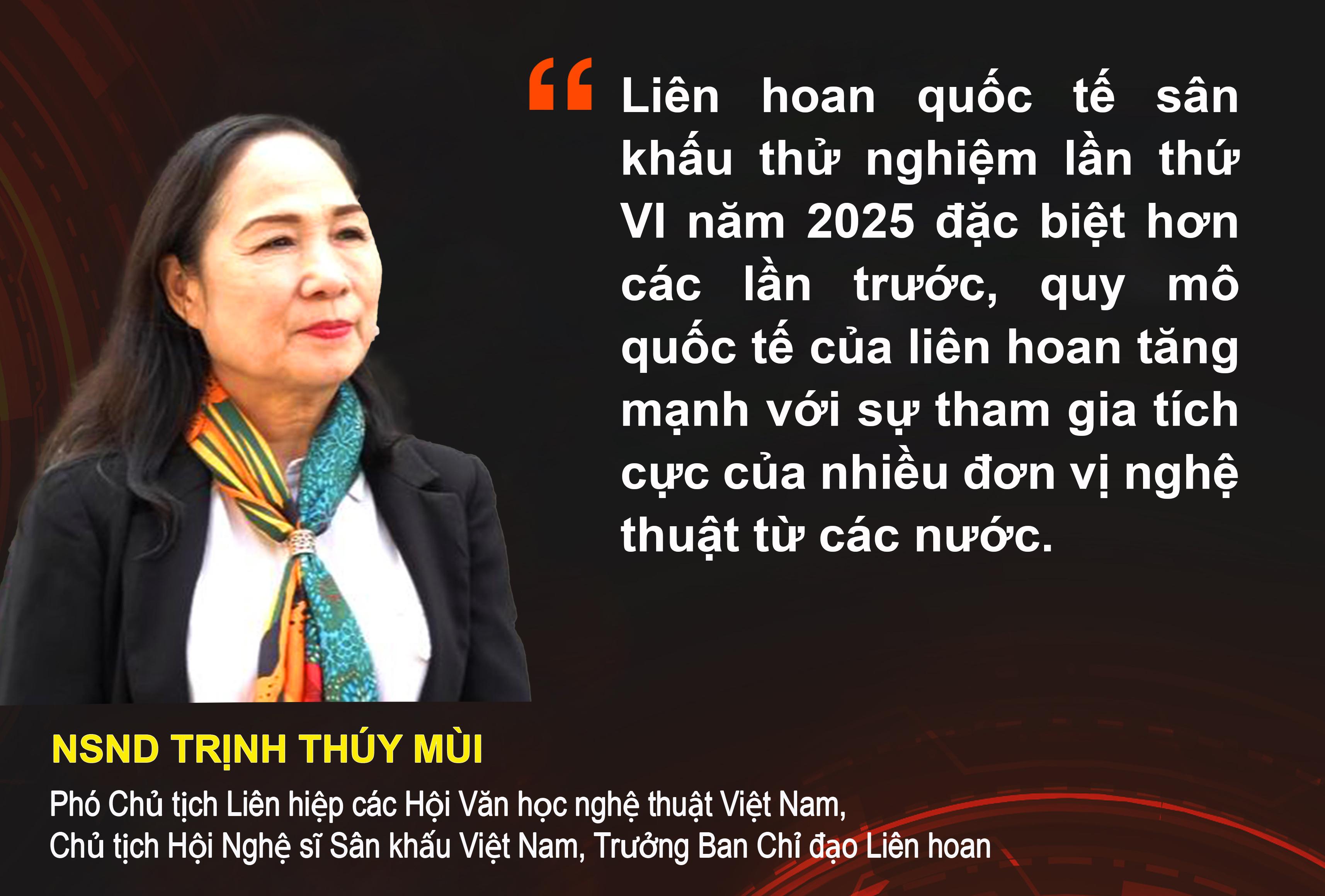 NSND Trịnh Thúy Mùi, Phó Chủ tịch Liên hiệp các Hội Văn học nghệ thuật Việt Nam, Chủ tịch Hội Nghệ sĩ Sân khấu Việt Nam, Trưởng Ban Chỉ đạo Liên hoan cho biết: Liên hoan quốc tế sân khấu thử nghiệm lần thứ VI năm 2025 đặc biệt hơn các lần trước nhờ hai yếu tố nổi bật. Các đoàn nghệ thuật Việt Nam đã đúc kết và áp dụng nhiều sáng tạo mới vào nghệ thuật sân khấu, tạo ra những trải nghiệm thử nghiệm độc đáo. Cùng với đó, quy mô quốc tế của Liên hoan tăng mạnh với sự tham gia tích cực của nhiều đơn vị nghệ thuật mạnh từ các nước.