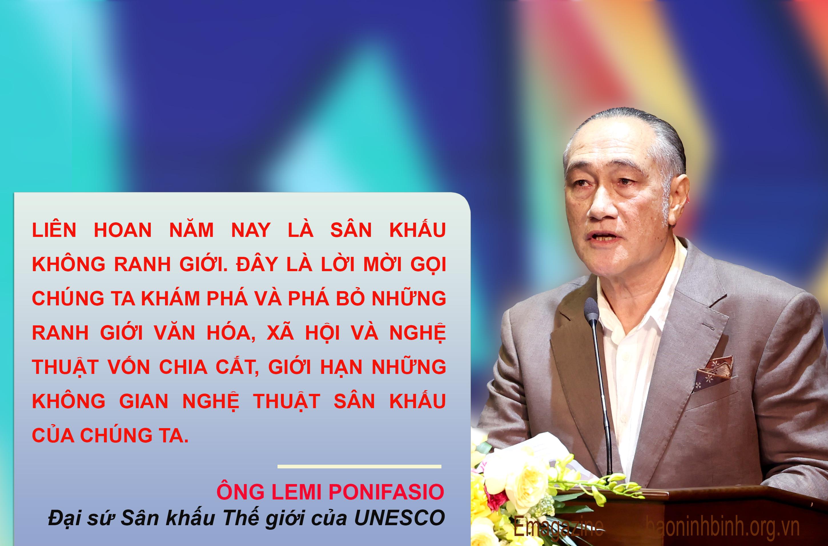 Ông Lemi Ponifasio, Đại sứ Sân khấu Thế giới của UNESCO cho biết: Chủ đề của Liên hoan năm nay là Sân khấu không ranh giới. Đây là lời mời gọi chúng ta khám phá và phá bỏ những ranh giới văn hóa, xã hội và nghệ thuật vốn chia cắt, giới hạn những không gian nghệ thuật sân khấu của chúng ta. Hãy chấp nhận những điều xa lạ-cả vẻ đẹp và thách thức của chúng. Vì Sân khấu không ranh giới chỉ bắt đầu từ một trái tim cởi mở.