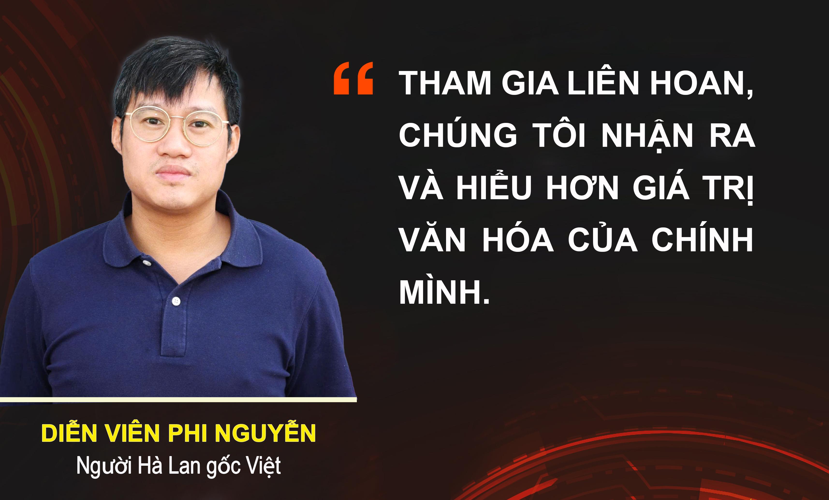 Diễn viên Phi Nguyễn, người Hà Lan gốc Việt chia sẻ: Khi biết mình lớn lên trong nền văn hóa nào, chúng ta sẽ dễ dàng kết nối với các nền văn hóa khác. Tôi rất ấn tượng với năng lượng, tài năng và tinh thần ham học hỏi của các diễn viên Việt Nam trong Liên hoan. Tôi hy vọng có cơ hội hợp tác và đóng góp vào sự phát triển của họ; được làm việc với các bạn tại Việt Nam là một trải nghiệm tuyệt vời đối với tôi.
