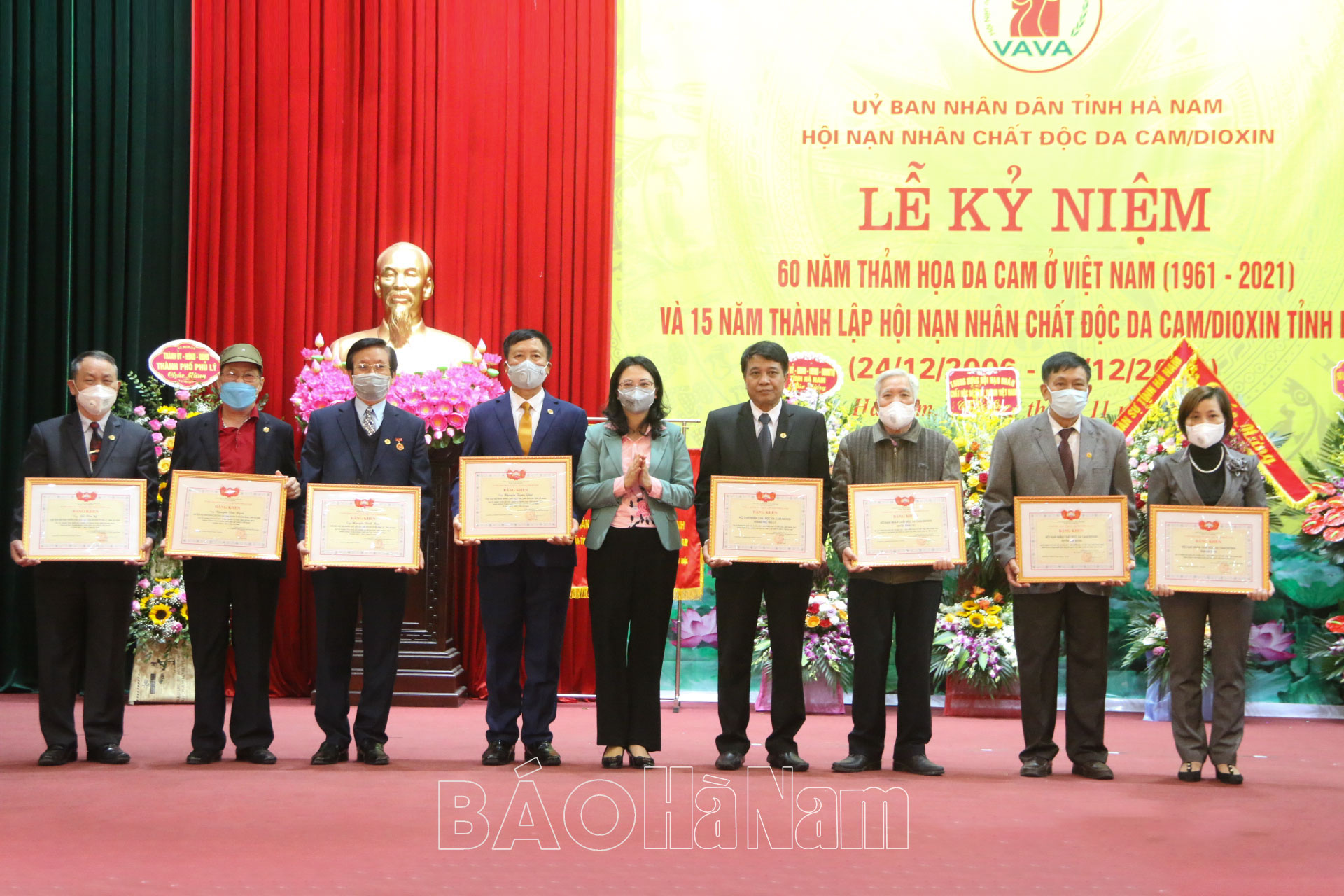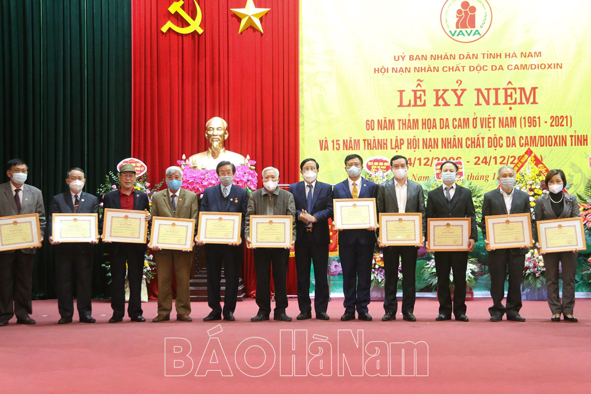 Nhân dịp này, Trung ương Hội NNCĐDC/dioxin Việt Nam hỗ trợ xây nhà tình nghĩa cho 2 gia đình NNCĐDC/dioxin có hoàn cảnh khó khăn về nhà ở (trị giá 50 triệu đồng/nhà); tặng 50 suất quà (mỗi xuất trị giá 1,2 triệu đồng) cho nạn nhân có hoàn cảnh khó khăn; Tỉnh ủy, HĐND- UBND tỉnh tặng 60 suất quà (500 nghìn đồng/suất) trị giá 30 triệu đồng. Cũng tại lễ kỷ niệm 54 cá nhân có thành tích đóng góp trong công tác xây dựng tổ chức hội được Trung ương Hội NNCĐDC/dioxin Việt Nam tặng Kỷ niệm chương; 12 tập thể, 9 cá nhân được Chủ tịch UBND tặng bằng khen; 4 tập thể, 5 cá nhân được Ủy ban MTTQ tỉnh tặng bằng khen; 14 tập thể, 14 cá nhân được Hội NNCĐDC/dioxin tỉnh tặng giấy khen./.