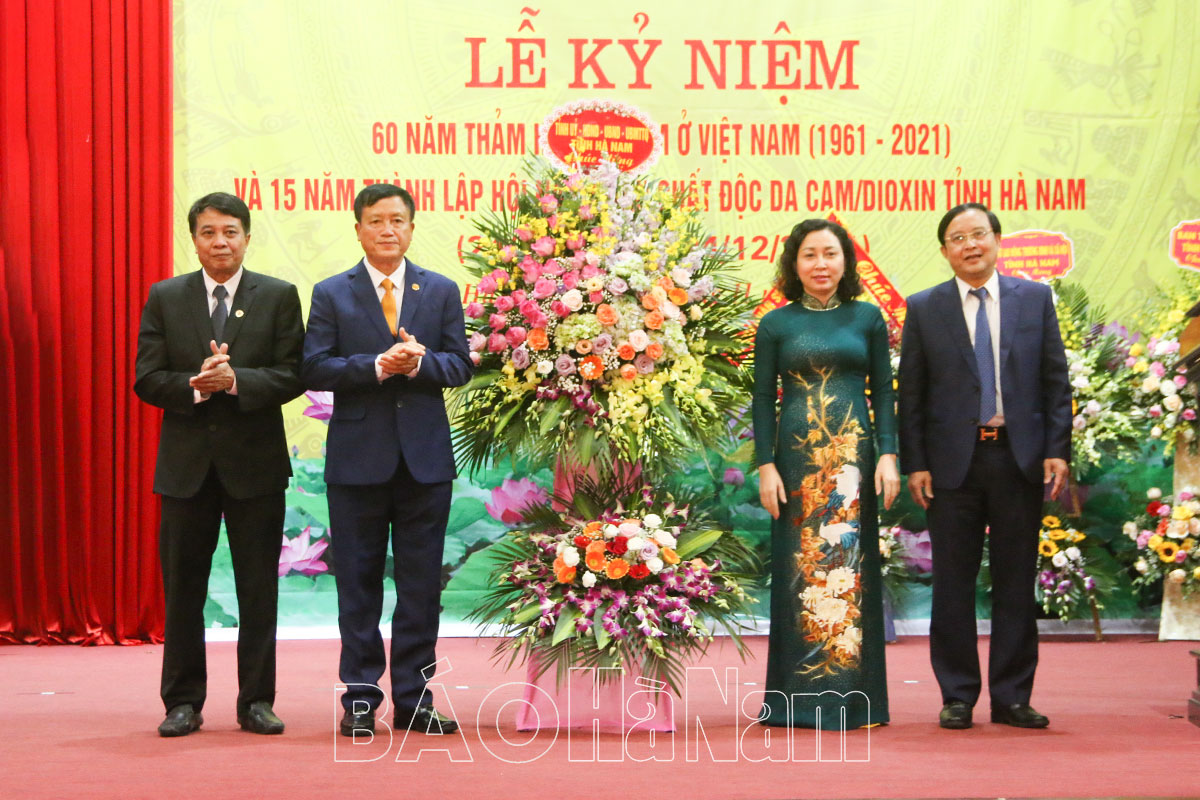 Thay mặt Tỉnh ủy, HĐND, UBND tỉnh, các đồng chí lãnh đạo tỉnh tặng Hội NNCĐDC/dioxin tỉnh lẵng hoa tươi thắm và bức trướng mang dòng chữ “Hội NNCĐDC/dioxin Hà Nam Đoàn kết – Nghĩa tình – Trách nhiệm vì nạn nhân chất độc da cam”.