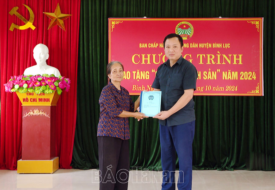 Đại diện Hội Nông dân huyện Bình Lục trao quyết định tặng bò vàng sinh sản cho hội viên Nguyễn Thị Chúc.
