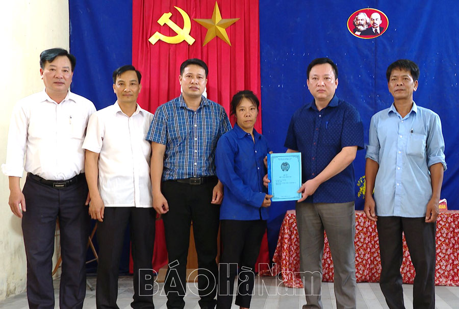 Hội Nông dân huyện Bình Lục và cấp ủy, chính quyền địa phương trao quyết định và hồ sơ nhận bò cho gia đình hội viên Cao Thị Tuyết Dung, thị trấn Bình Mỹ.