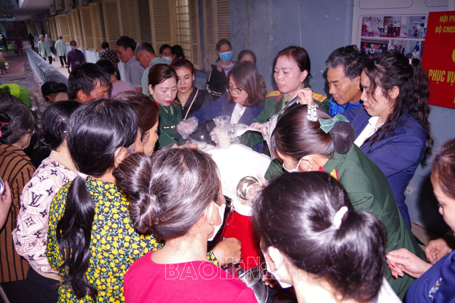 Chị em phụ nữ Bộ CHQS tỉnh và Chi nhánh Ngân hàng thương mại cổ phần Quân đội Hà Nam phát cháo cho bệnh nhân và người nhà bệnh nhân.