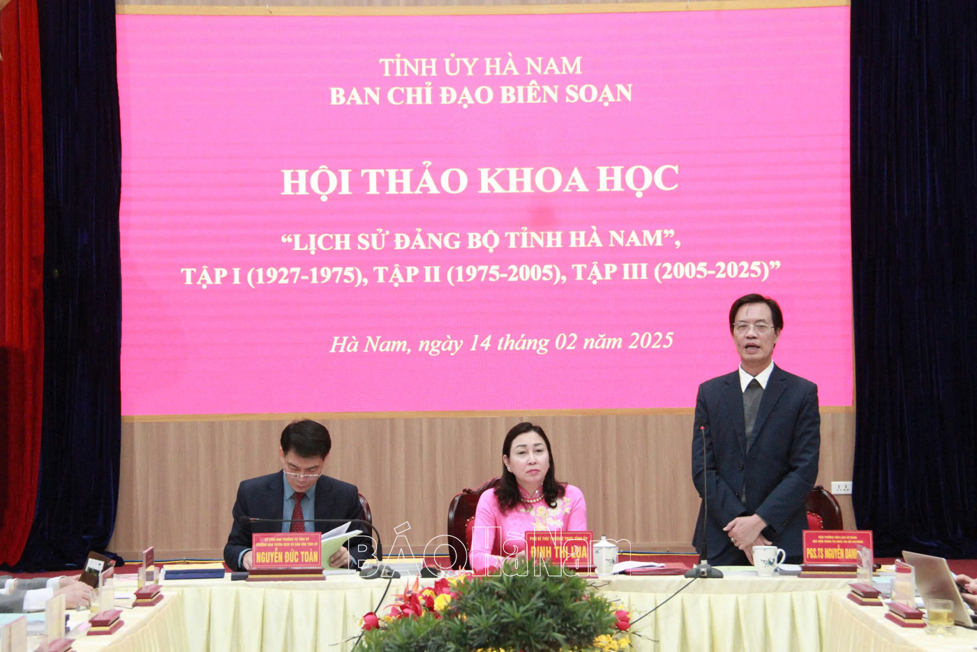 Báo cáo đề dẫn tại hội thảo nêu rõ: Bản thảo bộ sách Lịch sử Đảng bộ tỉnh Hà Nam tập I, II, III giai đoạn từ năm 1927 đến năm 2025 bảo đảm theo đúng yêu cầu kế thừa có chỉnh lý, bổ sung tập I, tập II Lịch sử Đảng bộ tỉnh Hà Nam giai đoạn 1927 - 2005, biên soạn mới tập III giai đoạn 2005 - 2025. Kết cấu các chương, mục tương đối hợp lý; nguồn tư liệu cơ bản toàn diện. Tập I, tập II giai đoạn từ năm 1927 đến năm 2005 đã được Hội đồng biên soạn nghiên cứu kỹ lưỡng, công phu; nhiều nội dung cần chỉnh sửa, bổ sung, cập nhật những tư liệu còn thiếu. Tập III giai đoạn từ 2005 - 2025 đã phác thảo cơ bản những sự kiện mới, phản ánh trung thực, khách quan, toàn diện những chủ trương lãnh đạo, chỉ đạo của Đảng bộ tỉnh và những kết quả nổi bật của tỉnh trên các lĩnh vực: kinh tế, văn hóa, xã hội, quốc phòng, an ninh, xây dựng Đảng và hệ thống chính trị; đồng thời, rút ra những bài học kinh nghiệm cho quá trình lãnh đạo, chỉ đạo thực hiện các nhiệm vụ chính trị trong những năm tiếp theo. Quá trình nghiên cứu, biên soạn bộ sách “Lịch sử Đảng bộ tỉnh Hà Nam”: tập I (1927 - 1975), tập II (1975 - 2005); tập III (2005 - 2025) đã được BCĐ quan tâm chỉ đạo chặt chẽ, triển khai nghiêm túc, công phu các khâu, các bước xây dựng đề cương, khai thác và xử lý tư liệu, nghiên cứu, biên soạn, xin ý kiến góp ý đến tiếp thu, chỉnh sửa, hoàn thiện bản thảo, tổ chức hội thảo.