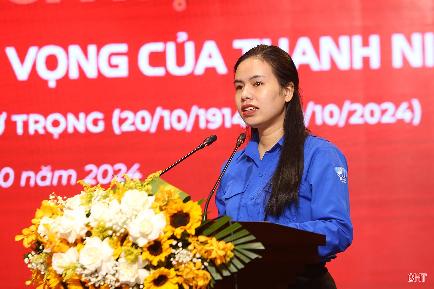 | Bí thư Tỉnh đoàn Hà Tĩnh Nguyễn Ny Hương tham luận nội dung: “Học tập và noi theo anh Lý Tự Trọng, thế hệ trẻ tỉnh Hà Tĩnh sẵn sàng dấn thân, xung kích, tình nguyện trong công cuộc xây dựng và bảo vệ Tổ quốc hiện nay”. |