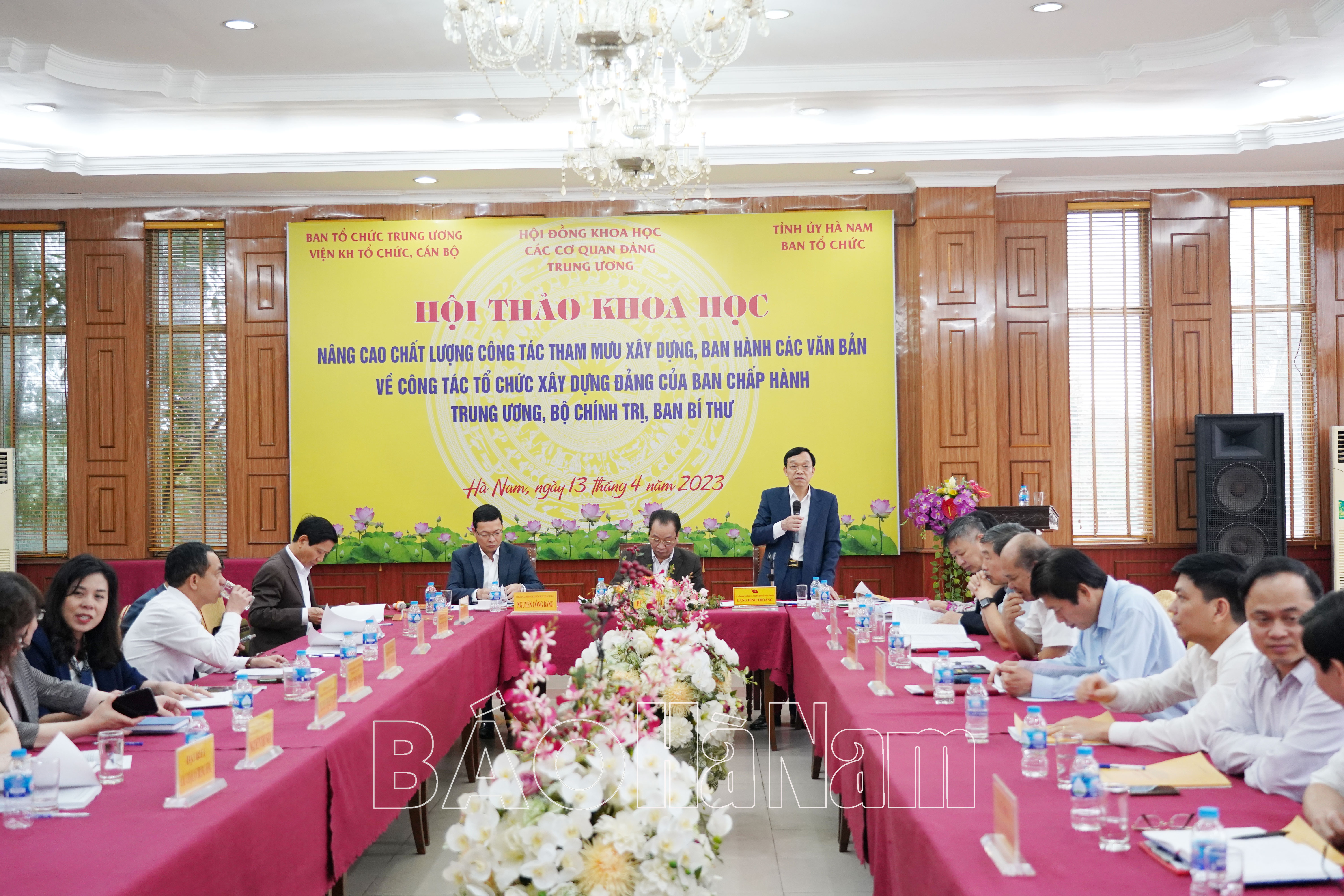 Chiều 13/4, Viện Khoa học tổ chức, cán bộ, Ban Tổ chức (BTC) Trung ương, Hội đồng Khoa học (HĐKH) các cơ quan Trung ương, BTC Tỉnh ủy Hà Nam phối hợp tổ chức Hội thảo khoa học Nâng cao chất lượng công tác tham mưu xây dựng, ban hành các văn bản về công tác tổ chức xây dựng Đảng (XDĐ) của Ban chấp hành (BCH) Trung ương, Bộ Chính trị, Ban Bí thư.