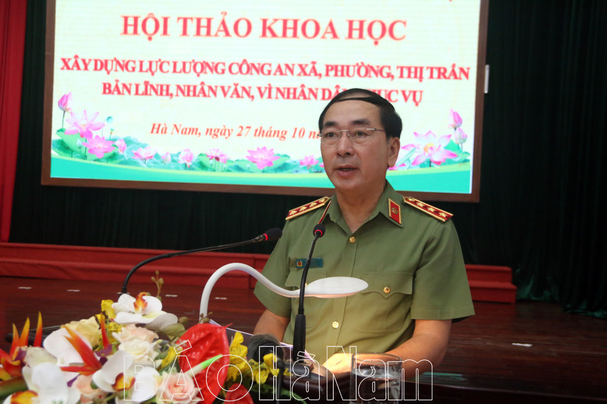 Phát biểu chỉ đạo hội thảo, Thượng tướng Trần Quốc Tỏ, Ủy viên Trung ương Đảng, Phó Bí thư Đảng ủy Công an Trung ương,Thứ trưởng Bộ Công an ghi nhận, đánh giá cao sự sáng tạo của Công an tỉnh Hà Nam phối hợp với Cục công tác Đảng và công tác chính trị (Bộ Công an) tổ chức hội thảo khoa học này. Đây là hội thảo có ý nghĩa thiết thực cả về lý luận và thực tiễn, phù hợp với chủ đề, bối cảnh nhằm góp phần xây dựng lực lượng CAND trong sạch, chính quy, tinh nhuệ, hiện đại, đáp ứng yêu cầu, nhiệm vụ trong tình hình mới. Đồng thời gợi ý cụ thể một số nội dung đề nghị các đại biểu tập trung thảo luận, như: Nhận thức rõ về quan điểm, chủ trương, lãnh đạo, chỉ đạo của Đảng, Nhà nước, Bộ Công an, của tỉnh Hà Nam về xây dựng lực lượng Công an xã, phường, thị trấn; các giải pháp về xây dựng đơn vị, chi bộ công an xã, phường, thị trấn trong sạch, vững mạnh về chính trị, tư tưởng, tổ chức, giỏi về chuyên môn.