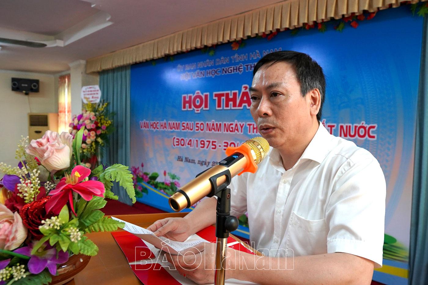 Phát biểu đề dẫn hội thảo, ông Nguyễn Văn Ngần, Chủ tịch Hội VHNT Hà Nam khẳng định vai trò của VHNT trong kháng chiến chống Mỹ và những đóng góp của văn nghệ sỹ đối với sự nghiệp cách mạng của dân tộc, góp phần làm nên chiến thắng 30/4/1975, giải phóng miền Nam, thống nhất đất nước. Đặc biệt 50 năm sau ngày đất nước thống nhất, văn học Hà Nam tiếp tục mạch nguồn sáng tác, nhiều nhà văn, nhà thơ Hà Nam khẳng định được sự nghiệp sáng tác của mình, cho ra đời nhiều tác phẩm có giá trị thúc đẩy phong trào VHNT toàn quốc, khu vực và của tỉnh.