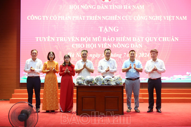 Các đơn vị phối hợp trao tặng mủ bảo hiểm cho hội viên nông dân huyện Bình Lục.