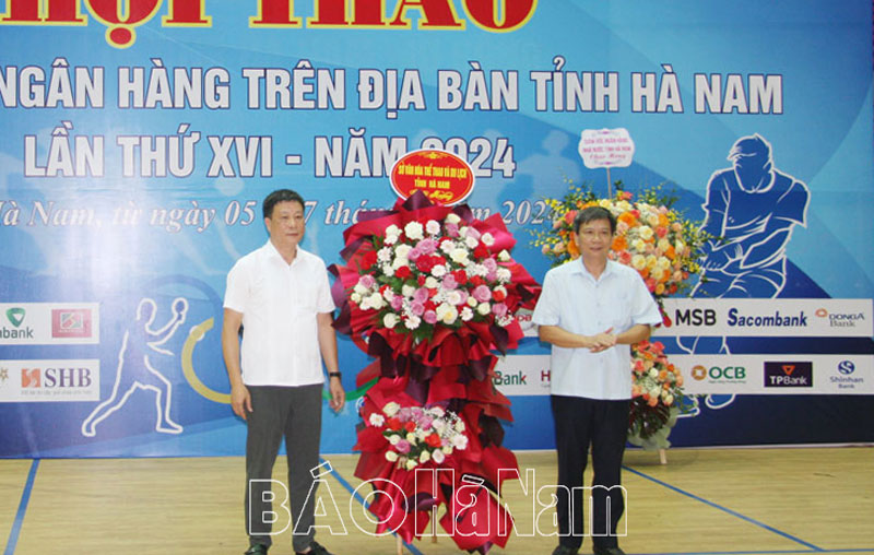 Lãnh đạo Ngân hàng Nhà nước Chi nhánh tỉnh Hà Nam tặng hoa chúc mừng Ban Tổ chưc hội thao.Lãnh đạo Sở Văn hóa - Thể thao và Du lịch tặng hoa chúc mừng hội thao.