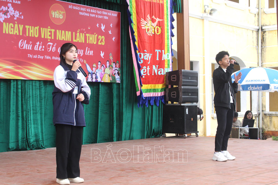 Sau tiếng trống khai hội Ngày thơ Việt Nam 2025, thầy, trò Trường THPT B Duy Tiên và các nhà thơ của Hội Văn học Nghệ thuật tỉnh đã cùng nhau cảm thụ về bài thơ “Nguyên Tiêu” của Chủ tịch Hồ Chí Minh, nghe đọc bài thơ “Người đi tìm hình của nước” của nhà thơ Chế Lan Viên và những bài thơ về đất nước, quê hương của thầy cô giáo, những nhà thơ của Bộ môn Thơ - Hội Văn học Nghệ thuật tỉnh, tiêu biểu như các nhà thơ: Nguyễn An Ninh, Lê Trung Hợp, Lan Hoàng, Đỗ Thị Nhàn, Nyteebx Thanh Ninh, Lại Ngọc Ngà, Phạm Quang Khuê, Nguyễn Hải Chi… Cùng với phần giao lưu thơ, các em học sinh Trường THPT B Duy Tiên còn biểu diễn nhiều tiết mục văn nghệ với những bài hát ca ngợi tình yêu quê hương, đất nước, như: “Quê hương”, “Tình anh”…