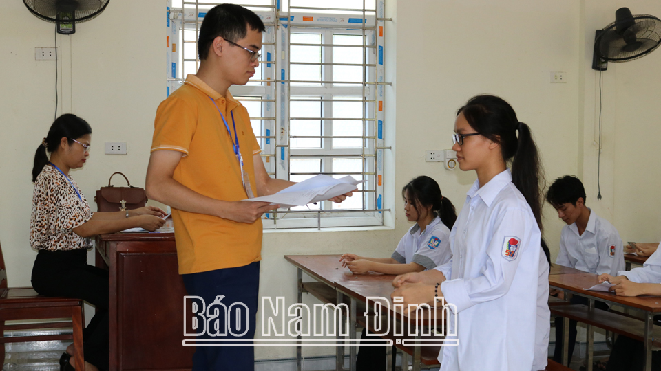 | Cán bộ coi thi phát thẻ dự thi cho thí sinh tại điểm thi Trường THPT Hoàng Văn Thụ (Vụ Bản). |