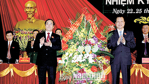 Cuối phiên làm việc buổi sáng, thay mặt Đại hội, các đồng chí: Nguyễn Khắc Hưng, Bí thư Tỉnh ủy; Trần Văn Chung, Phó Bí thư Thường trực Tỉnh ủy, Chủ tịch HĐND tỉnh; Đoàn Hồng Phong, Phó Bí thư Tỉnh ủy, Chủ tịch UBND tỉnh đã nhận hoa chúc mừng của các đồng chí Phó Thủ tướng Chính phủ; các bộ: GTVT, Xây dựng, TN và MT, Bộ Tư lệnh Quân khu 3, Hội đồng hương Nam Định tại Hà Nội, Hội đồng hương Nam Định tại Thành phố Hồ Chí Minh.