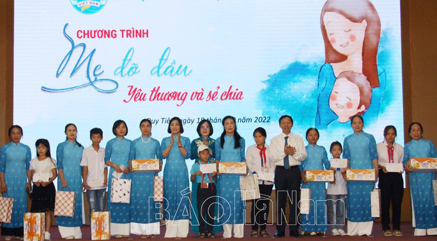 Lãnh đạo Hội LHPN tỉnh và lãnh đạo thị xã Duy Tiên trao quà cho các em có hoàn cảnh khó khăn trên địa bàn.