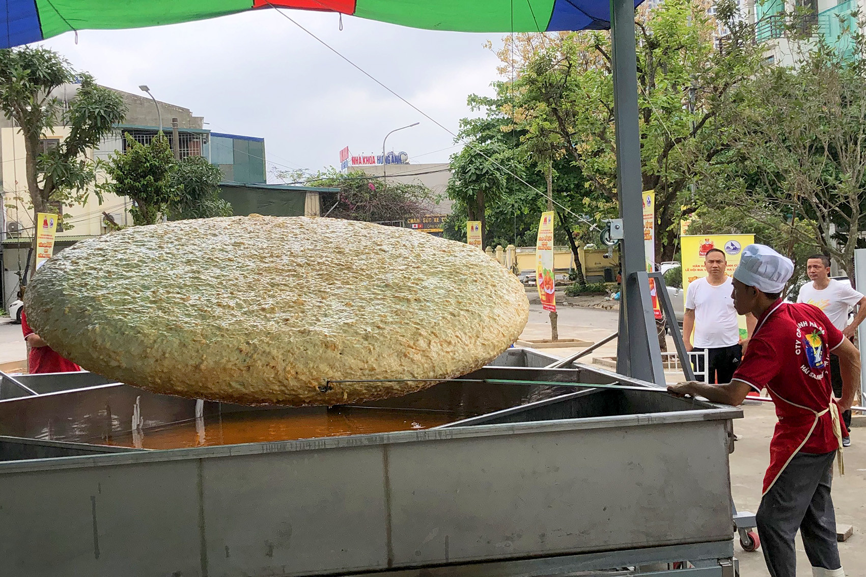 Chiếc chả mực có đường kính 2,5m, độ dày 30cm, chiên trong chảo cỡ lớn hơn 3m. Ảnh: P.C