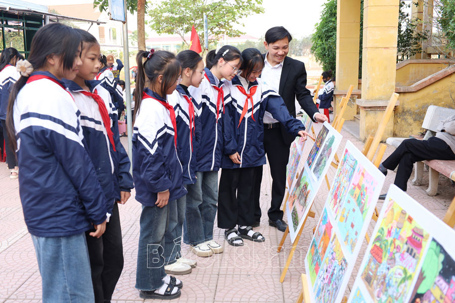 Thầy và trò Trường THCS Đạo Lý xem những bức tranh đoạt giải tại Cuộc thi nét vẽ xanh chủ đề "Hà Nam trong mắt em". Nhiều cuốn sách hay thu hút các em học sinh.