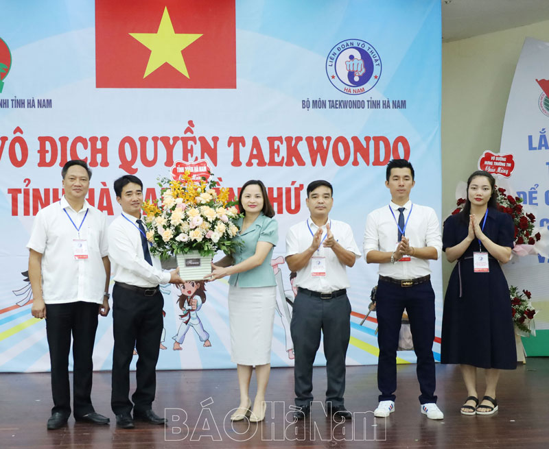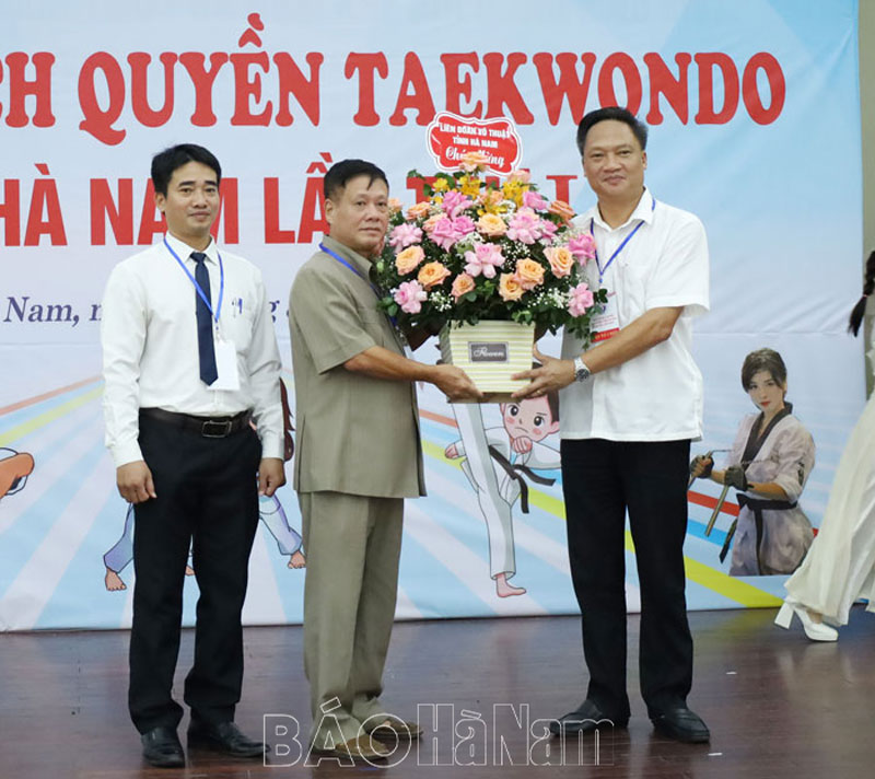 Lãnh đạo Liên đoàn Võ thuật tỉnh Hà Nam tặng hoa chúc mừng Ban tổ chức Giải vô địch quyền Taekwondo tỉnh năm 2024.Đại diện lãnh đạo Tỉnh đoàn tặng hoa chúc mừng Ban tổ chức giải.