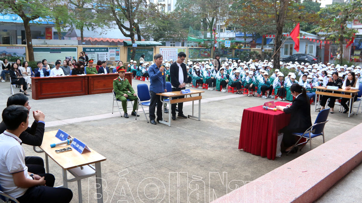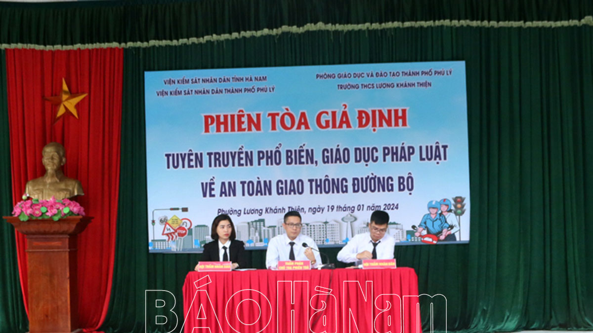 Nhằm đổi mới cách thức tuyên truyền, phổ biến, giáo dục pháp luật (TTPBGDPL) đến với học sinh một cách hiệu quả, góp phần xây dựng môi trường văn hóa học đường an toàn, lành mạnh, sáng 19/1, tại Trường THCS Lương Khánh Thiện, Viện Kiểm sát nhân dân thành phố Phủ Lý phối hợp với Ban giám hiệu nhà trường tổ chức phiên tòa giả định, TTPBGDPL về an toàn giao thông (ATGT) đường bộ. Chương trình có sự tham gia của trên 600 cán bộ, giáo viên, học sinh nhà trường.