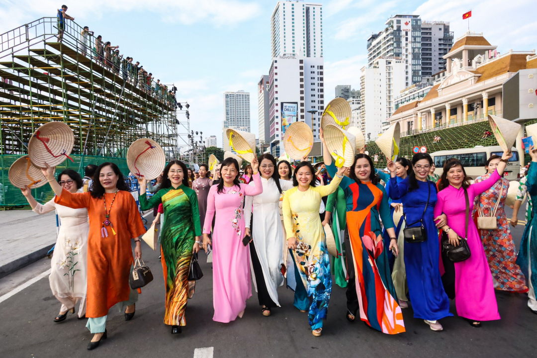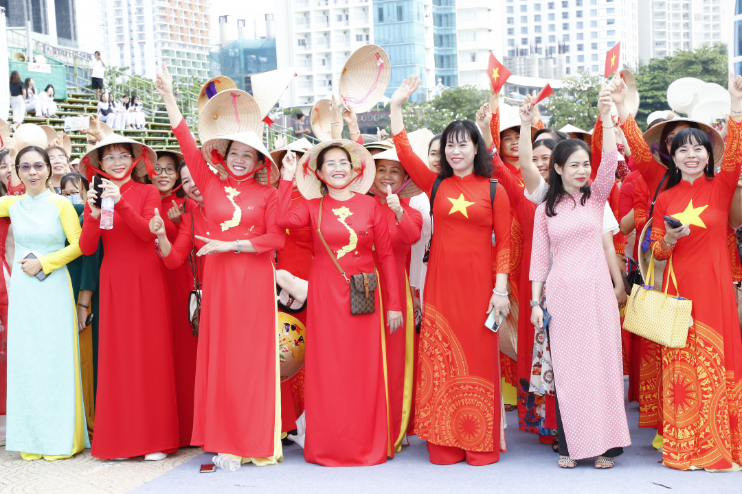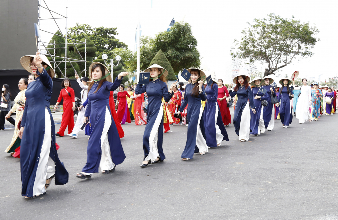 Tham gia diễu hành, hàng nghìn tà áo dài đủ màu sắc, những nét mặt rạng ngời niềm tự hào đã điểm tô cho phố biển thêm rực rỡ trong dịp lễ hội biển. “Tôi yêu áo dài Việt Nam”, “Tôi yêu Việt Nam”… là những khẩu hiệu được các chị em đồng thanh hô vang theo từng bước đi uyển chuyển, duyên dáng dạo quanh phố phường, tôn thêm vẻ đẹp sinh động cho tà áo dài.
