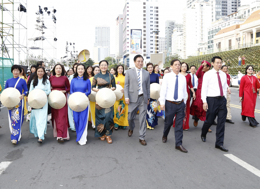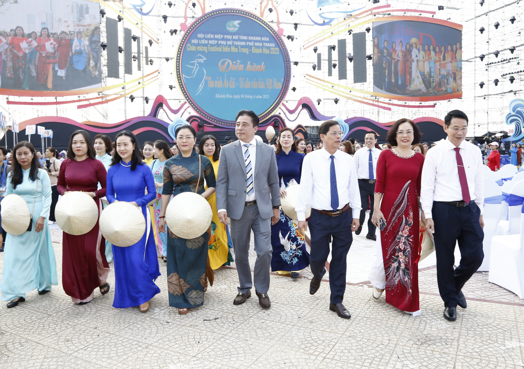 Rạng sáng 4-6, hơn 6.000 phụ nữ Khánh Hòa đã tề tựu về Quảng trường 2-4, TP. Nha Trang để cùng tham gia chương trình diễu hành “Tôn vinh áo dài - di sản văn hóa Việt Nam”. Cùng dự và tham gia diễu hành có các ông: Nguyễn Khắc Toàn - Phó Bí thư Thường trực Tỉnh ủy, Chủ tịch HĐND tỉnh; Nguyễn Tấn Tuân - Phó Bí thư Tỉnh ủy, Chủ tịch UBND tỉnh; Đinh Văn Thiệu, Phó Chủ tịch UBND tỉnh; Nguyễn Văn Xáng, đại diện Văn phòng Tổ chức Kỷ lục Việt Nam tại Miền Trung và hàng nghìn người dân, du khách.