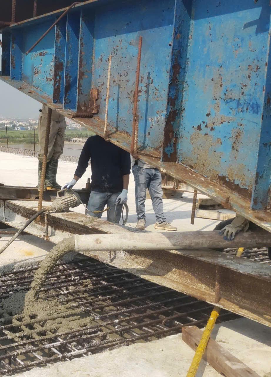 | Công nhân đổ những khối bê tông cuối cùng hợp long cầu. |