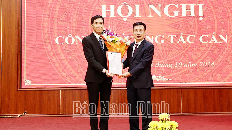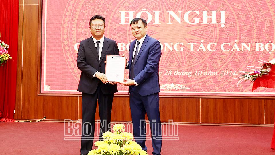 Lãnh đạo Ban Tổ chức Tỉnh ủy công bố Quyết định số 1258-QĐ/TU, ngày 25/10/2024 của Ban TVTU về việc đồng chí Đinh Hoàng Dũng, Phó Chánh Văn phòng UBND tỉnh thôi giữ chức vụ Phó Chánh Văn phòng UBND tỉnh để luân chuyển, chỉ định tham gia BCH Đảng bộ huyện, Ban Thường vụ Huyện ủy, giữ chức vụ Phó Bí thư Huyện ủy Giao Thủy nhiệm kỳ 2020-2025 từ ngày 28/10/2024 và giới thiệu ứng cử giữ chức vụ Chủ tịch UBND huyện Giao Thủy nhiệm kỳ 2021-2026.